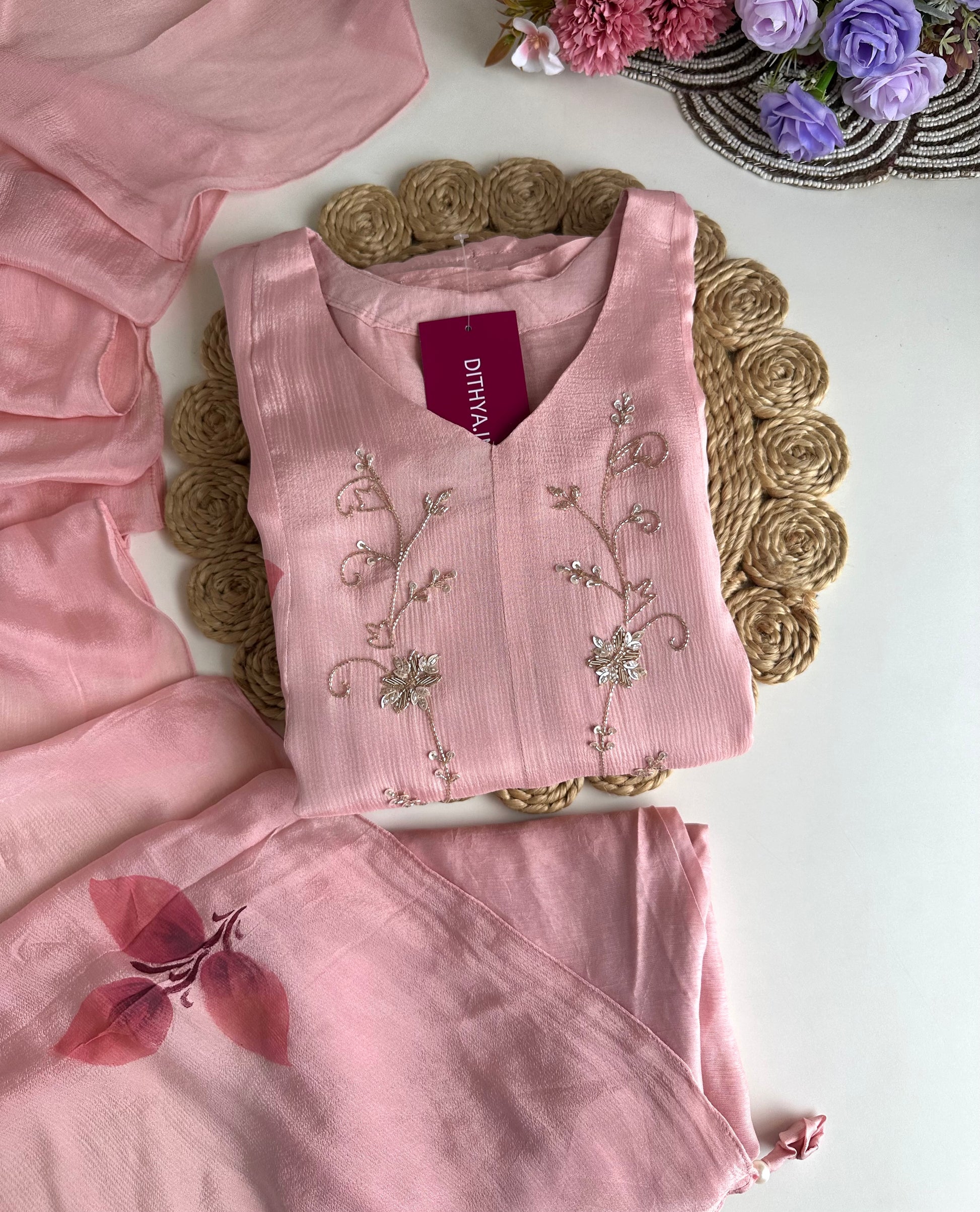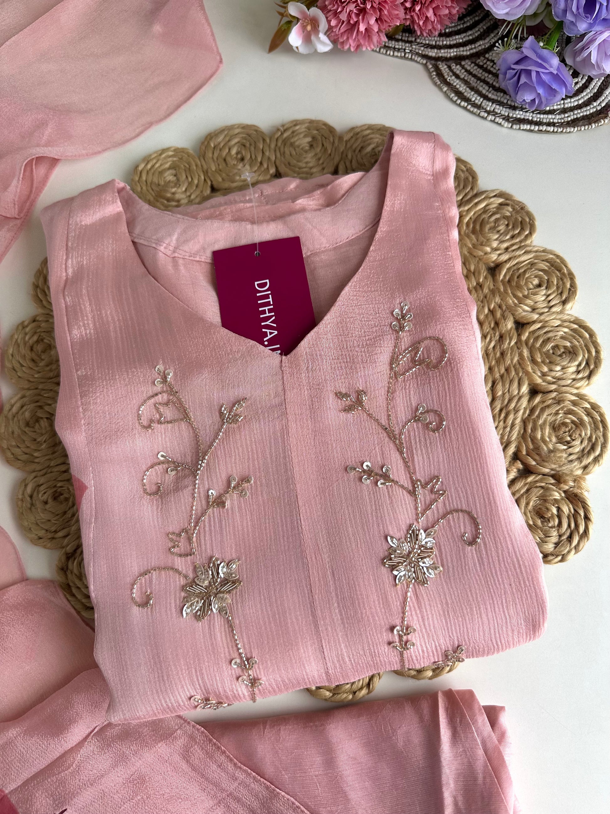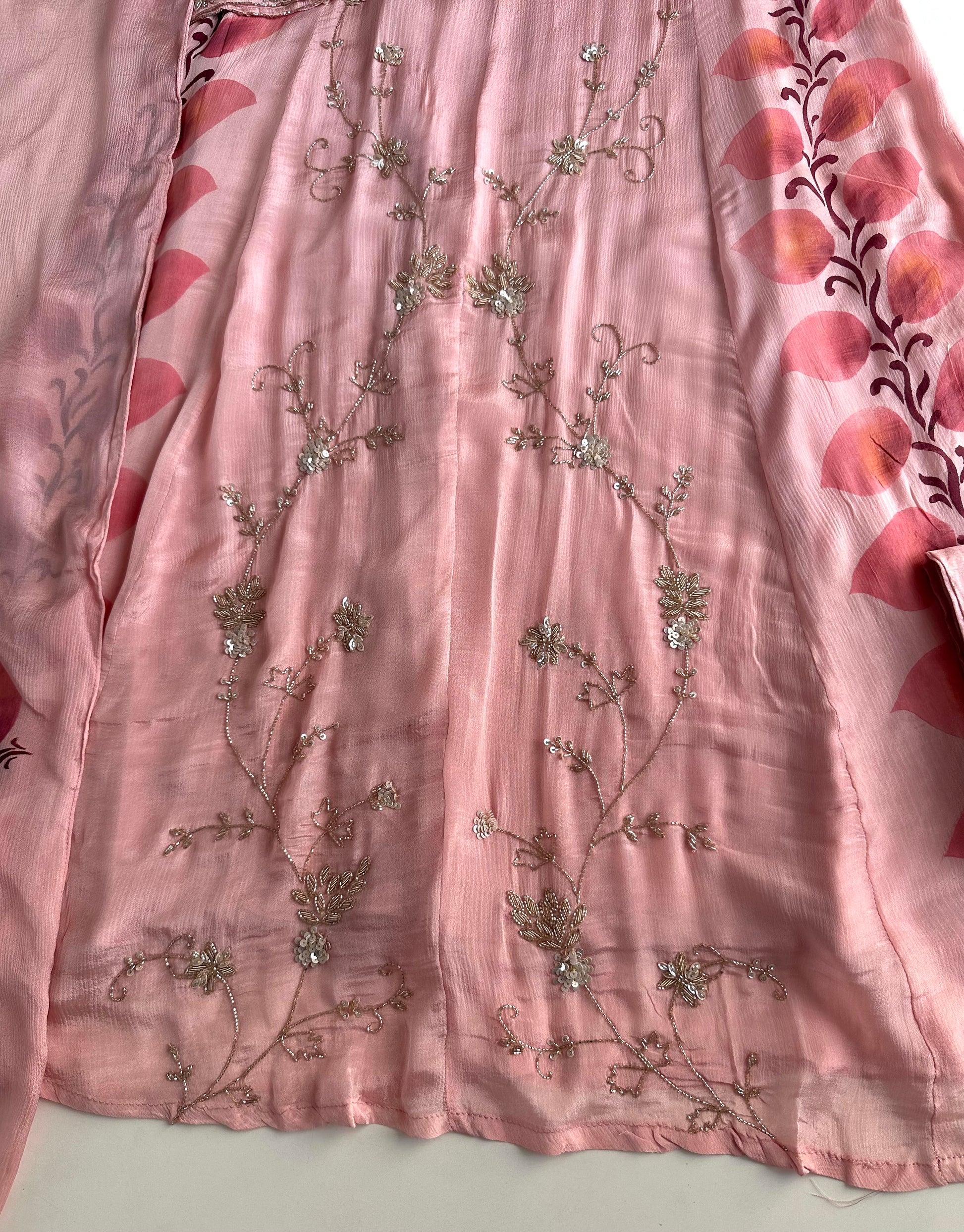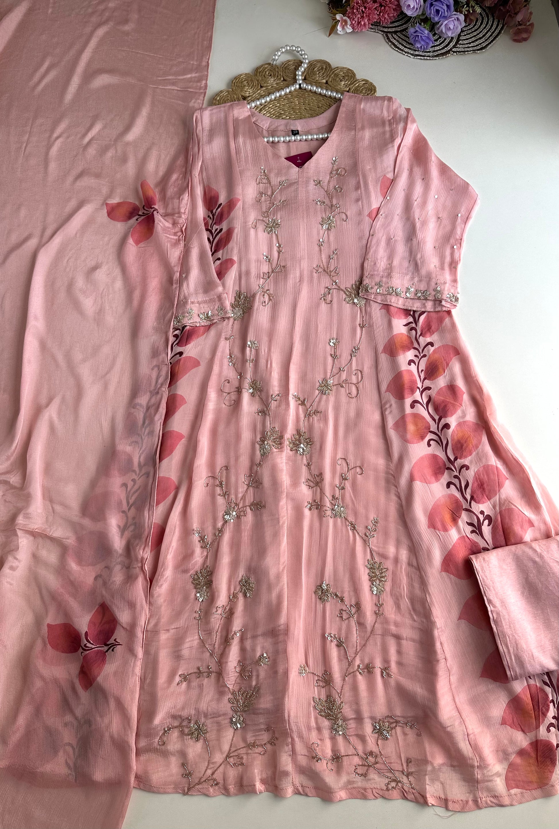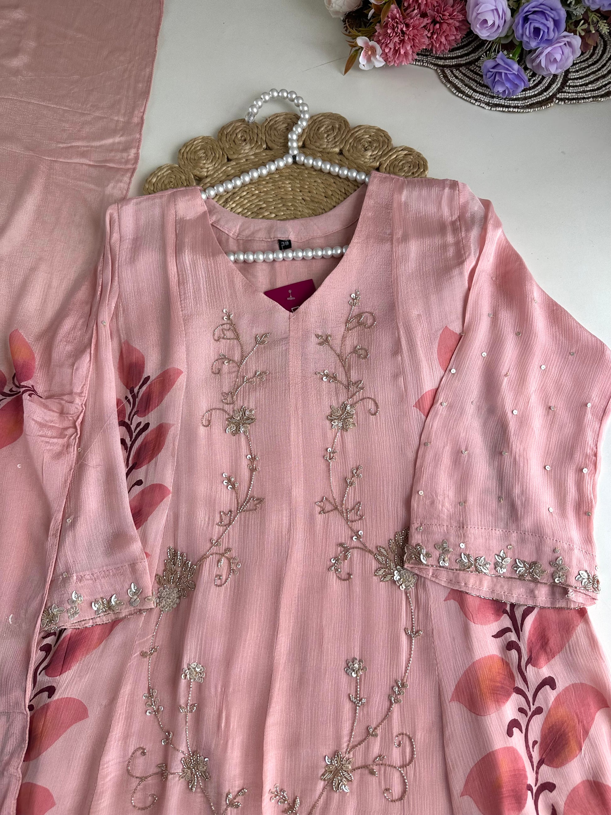 Expertly crafted from high-quality chinnon fabric, our Chinnon Heavy Anarkali with pants and dupatta set is a beautiful ensemble for any occasion. The heavy anarkali design offers a sophisticated and elegant look, while the included pants and dupatta provide versatility and convenience. Elevate your wardrobe with this stunning piece.
