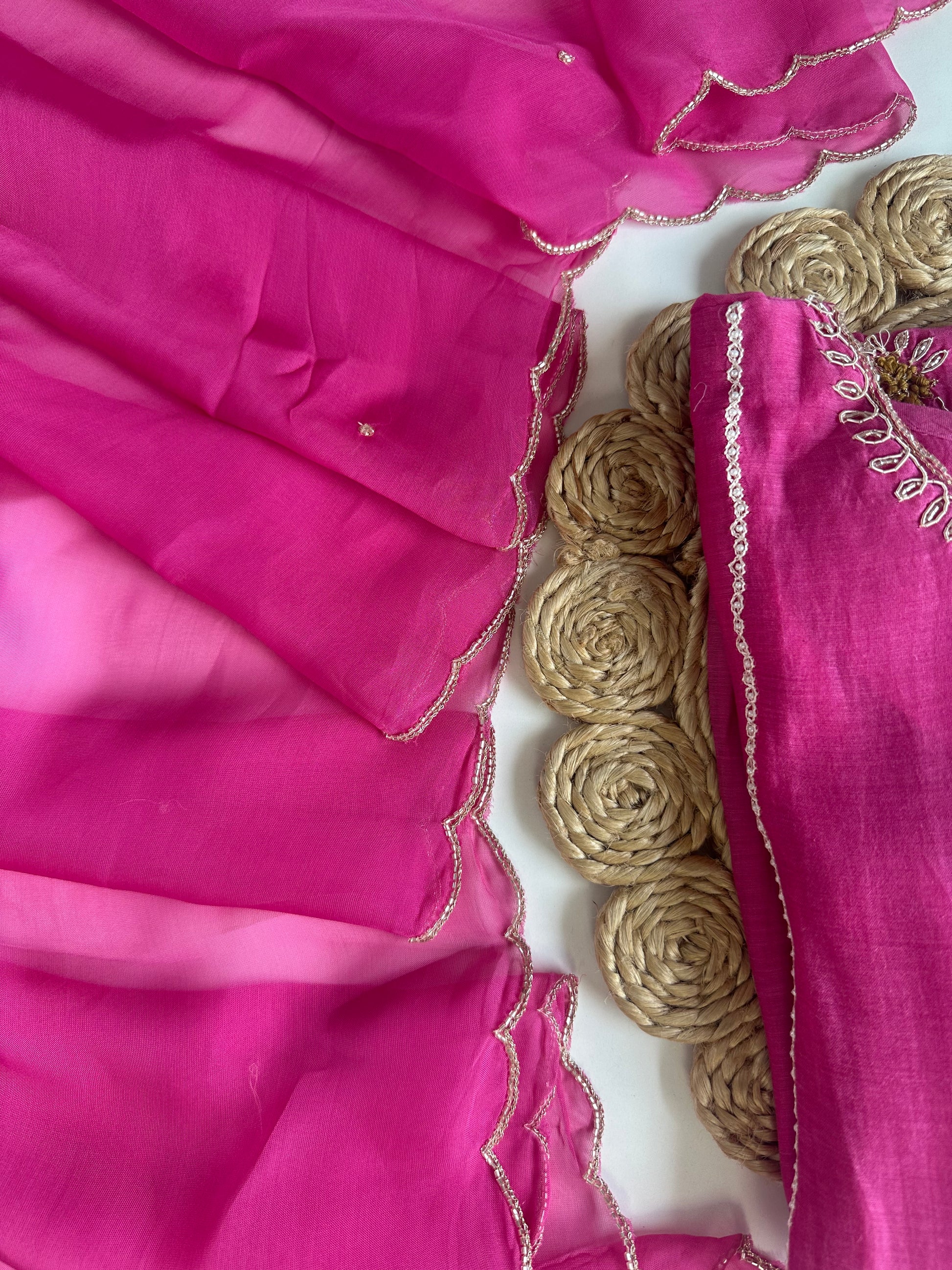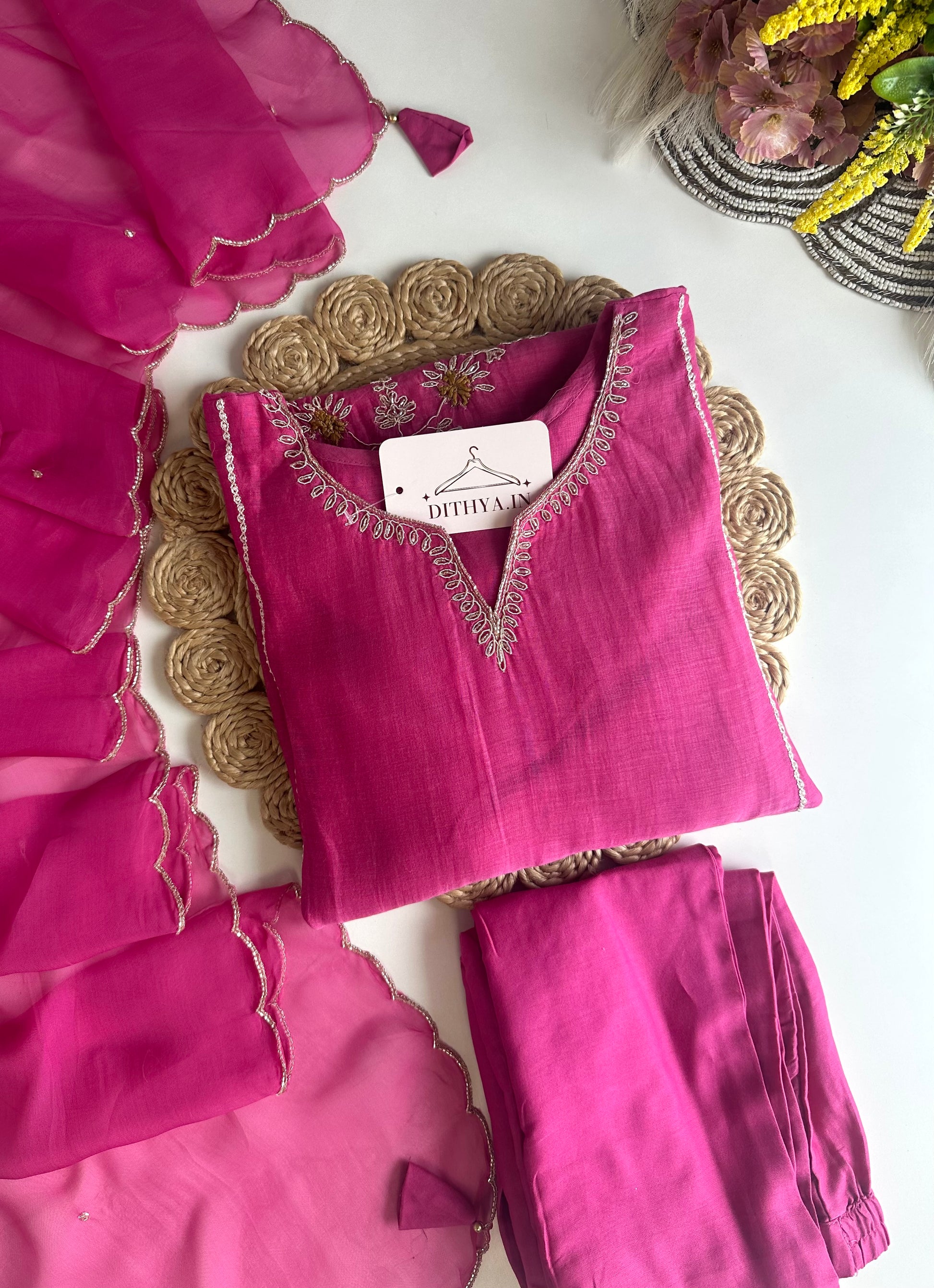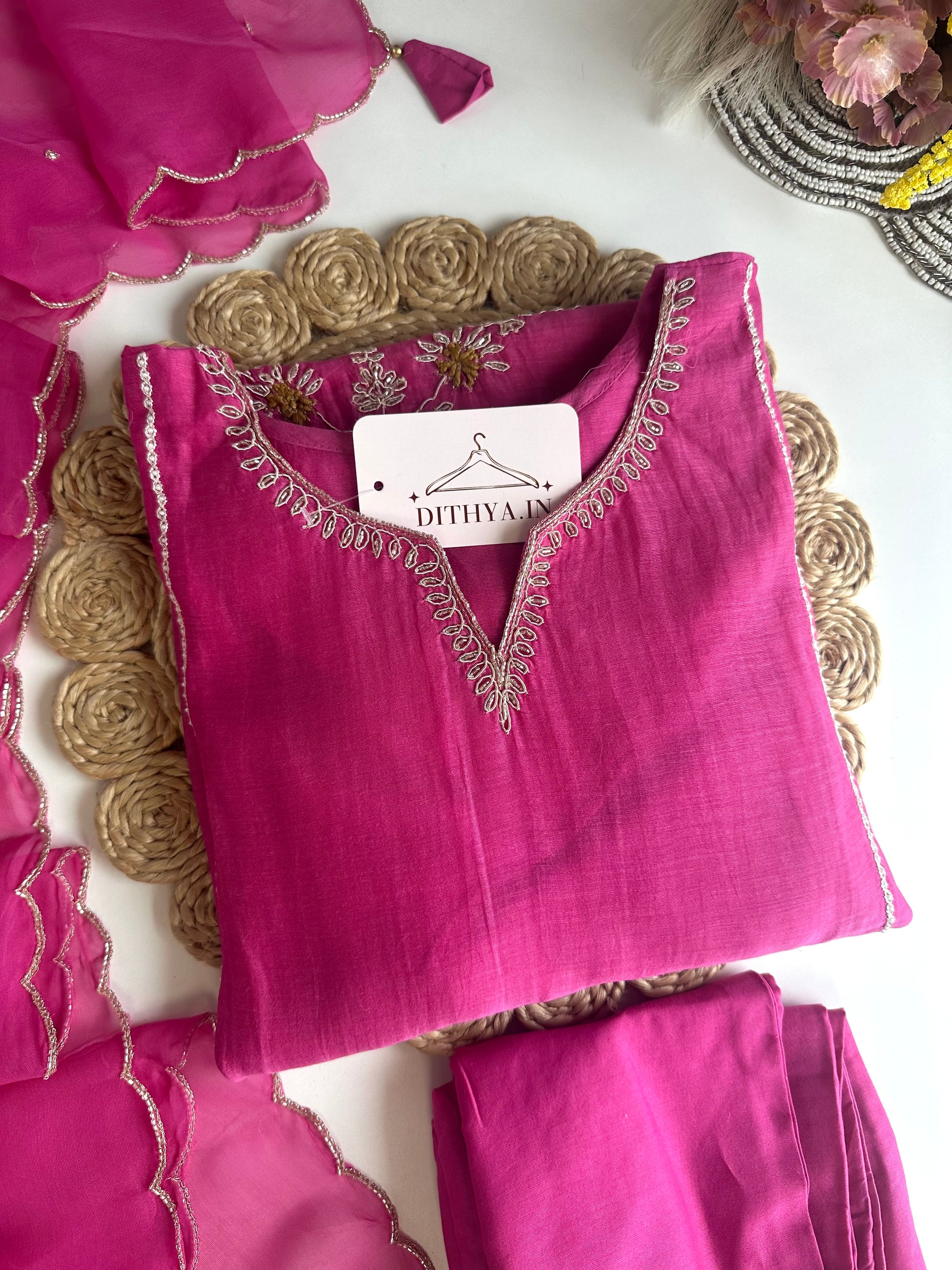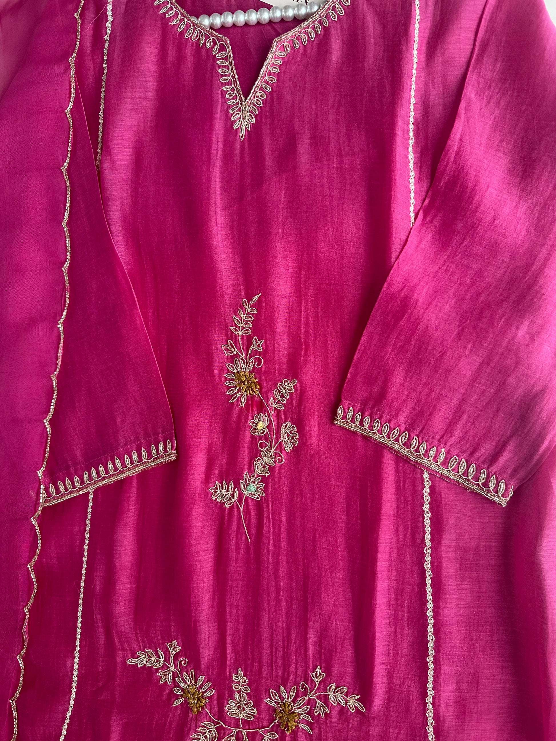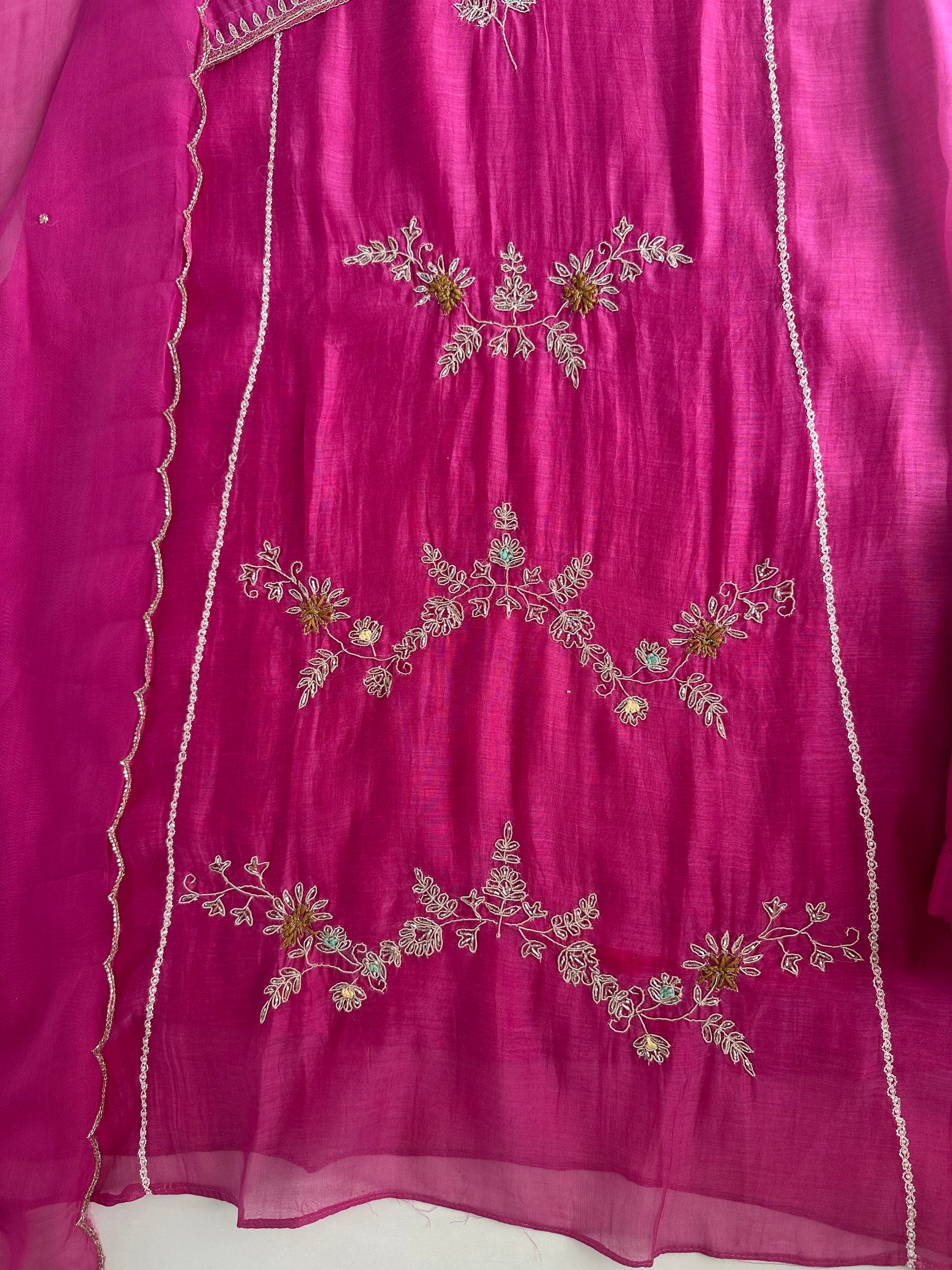 K477 - Mul Chanderi handwork Aline Kurti with pants and dupatta