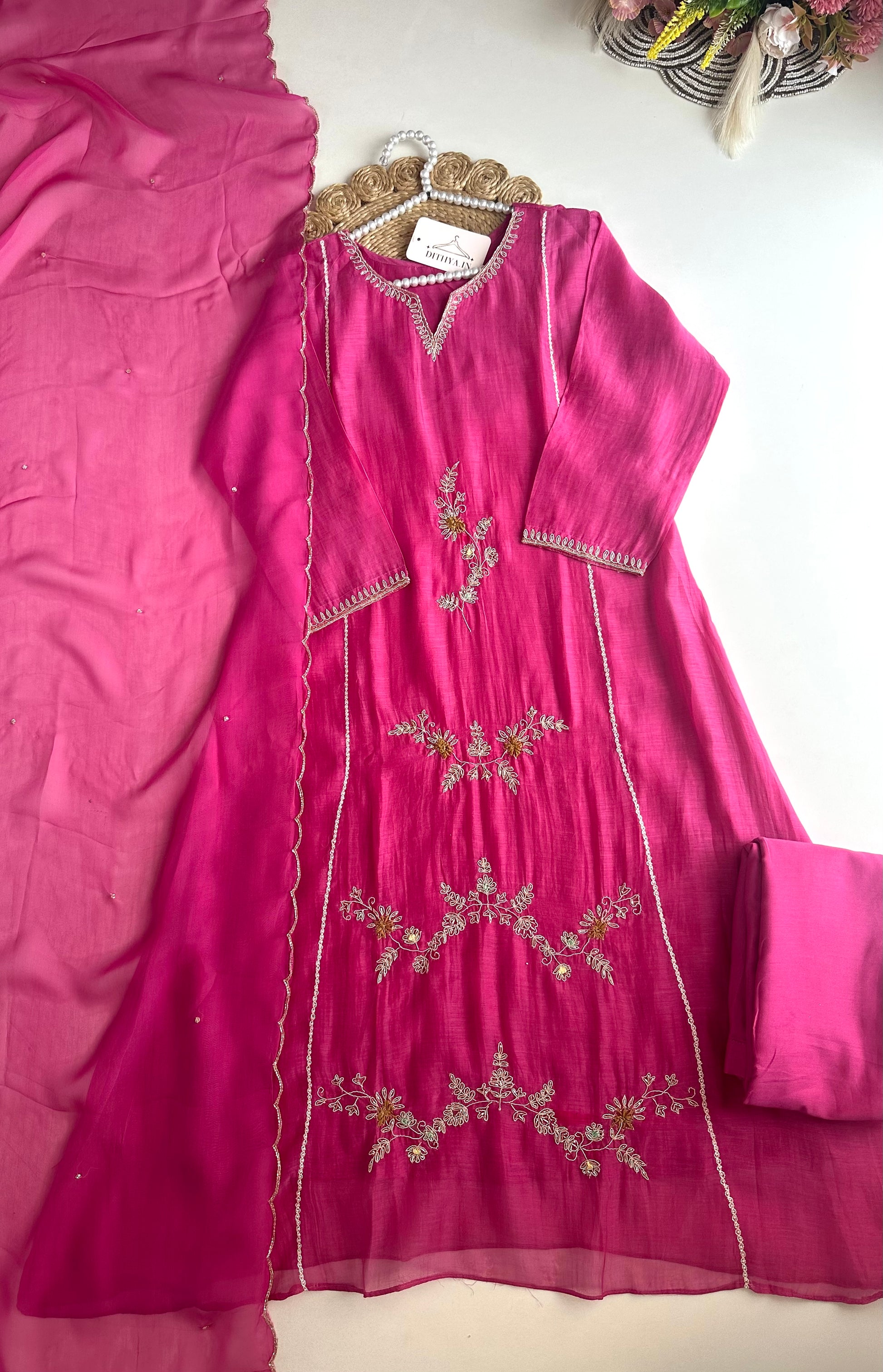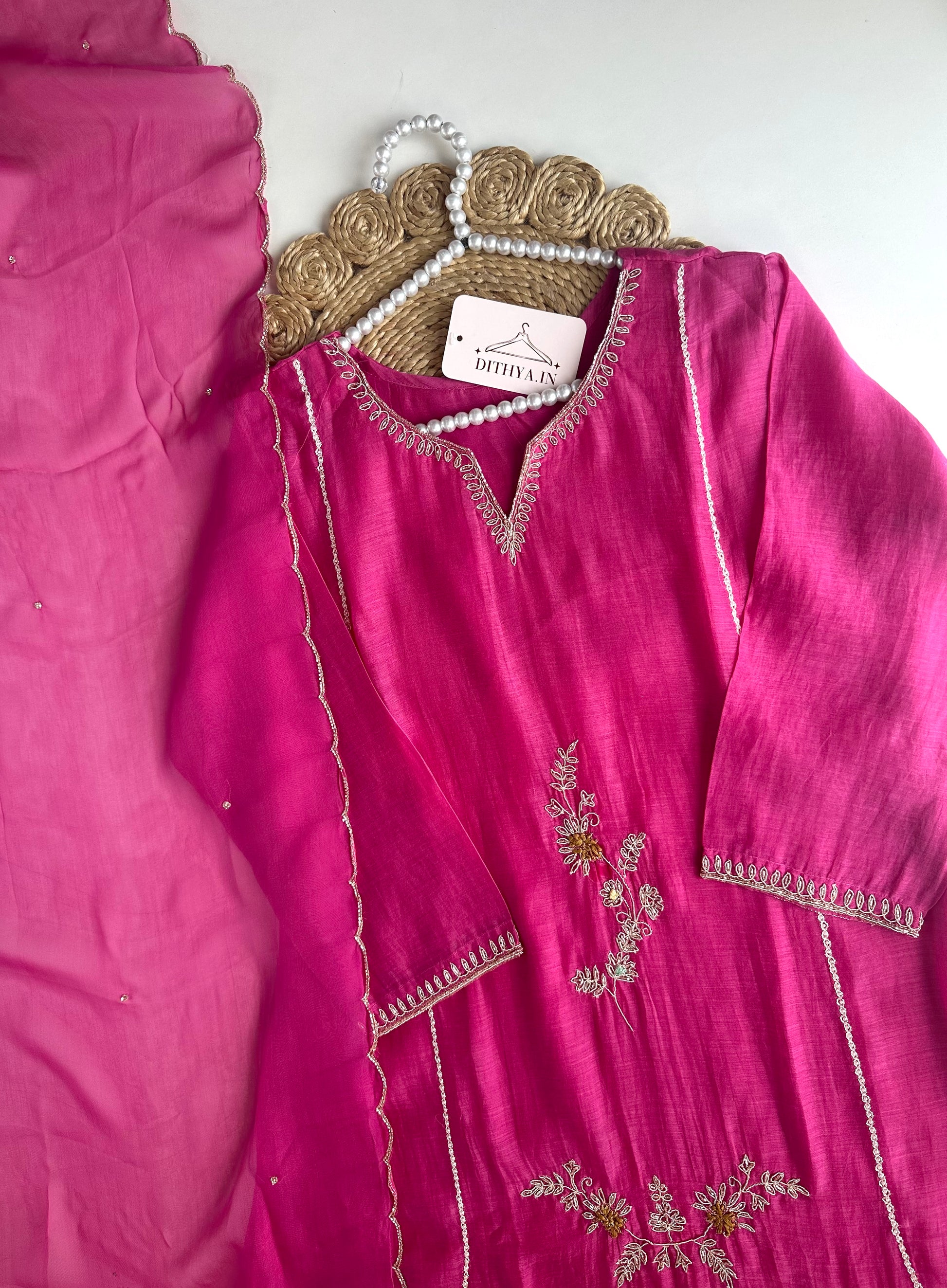This Mul Chanderi handwork Aline Kurti is a must-have addition to your wardrobe. With intricate handwork detailing, it exudes elegance and sophistication. Paired with comfortable pants and a dupatta, this Aline Kurti offers both style and comfort. Elevate your style game with this stunning piece.