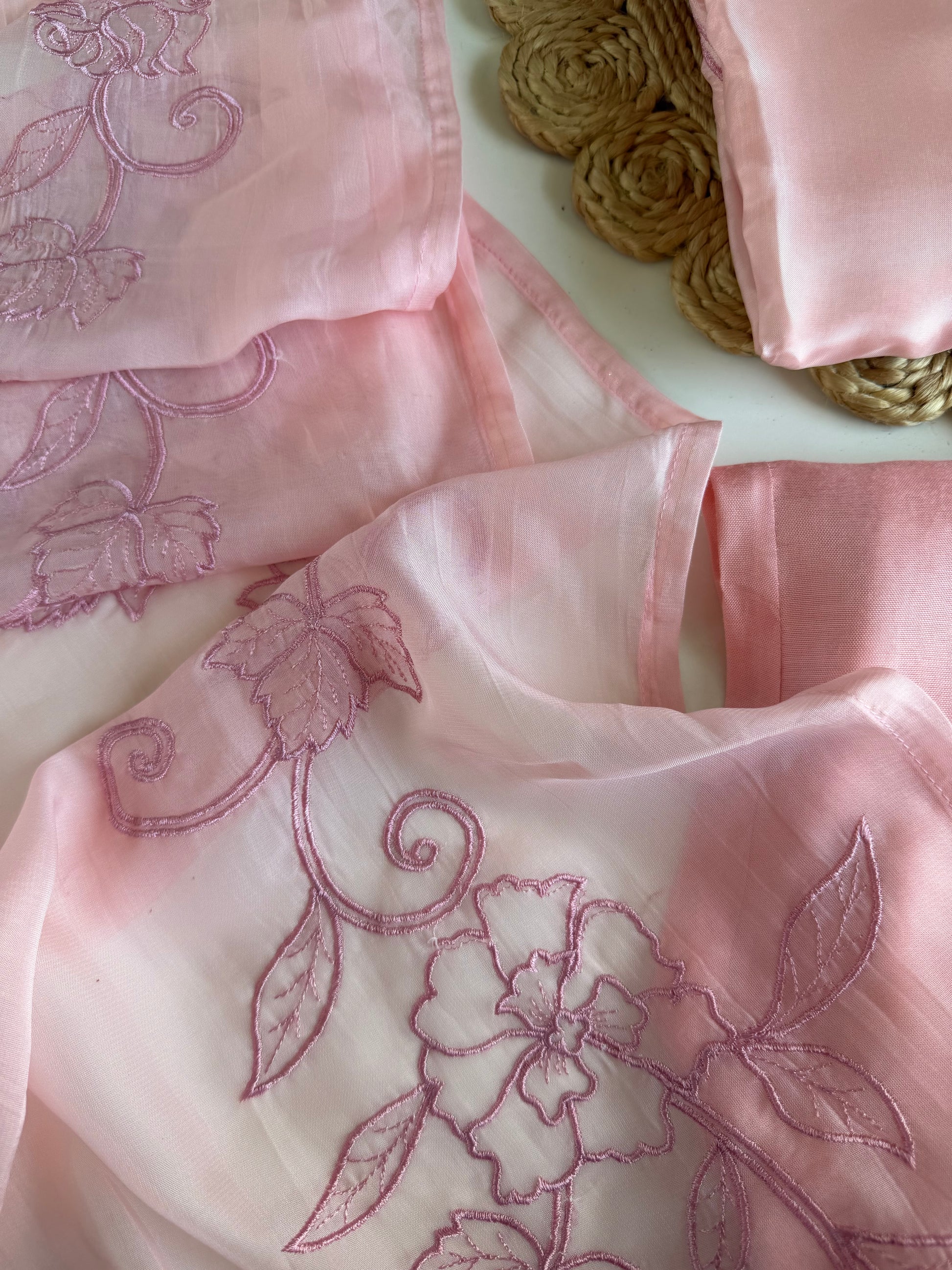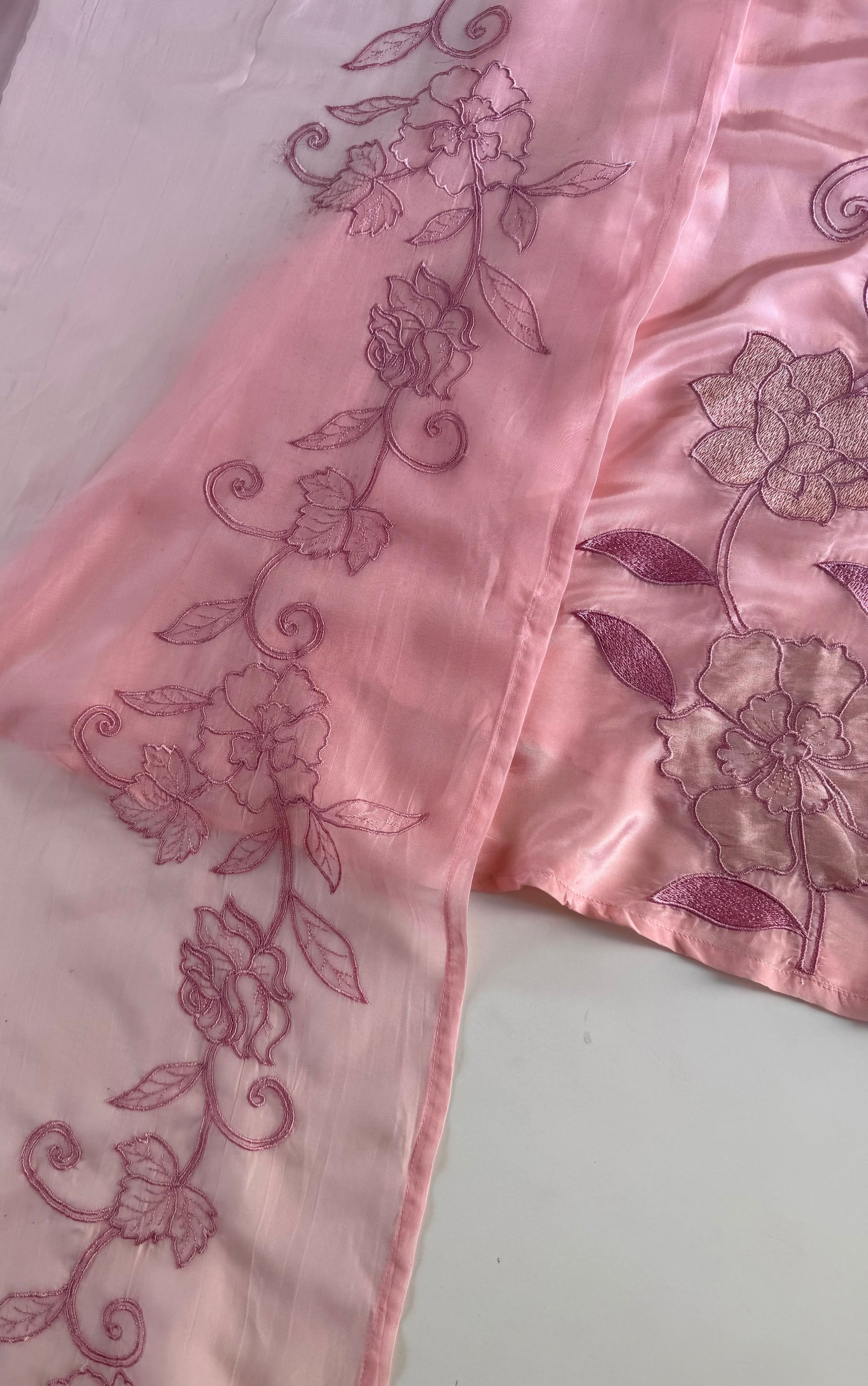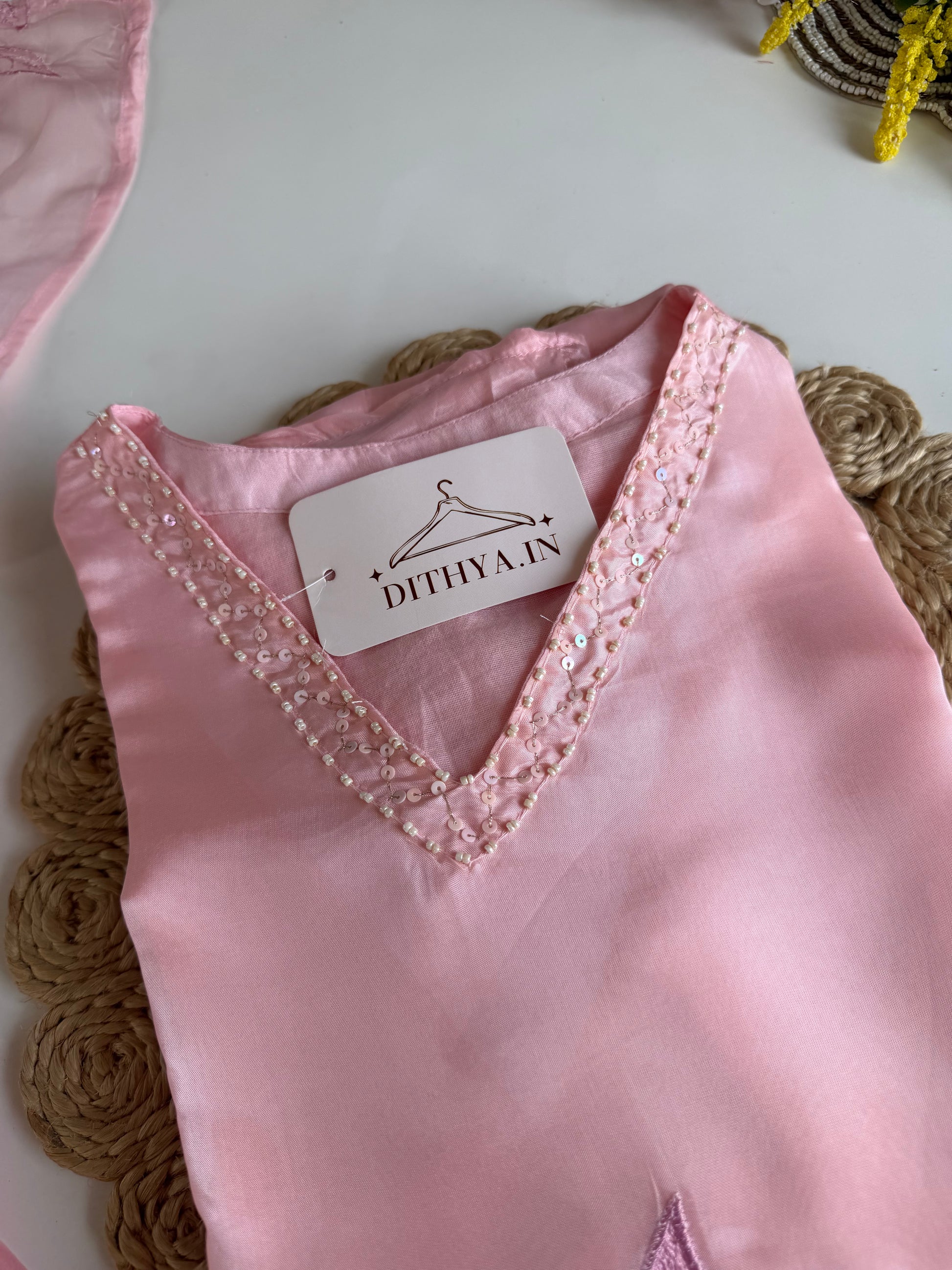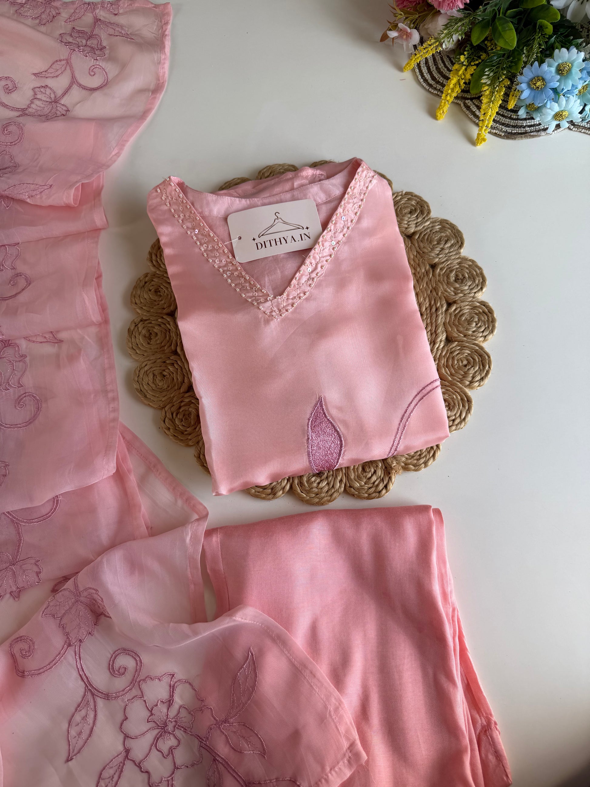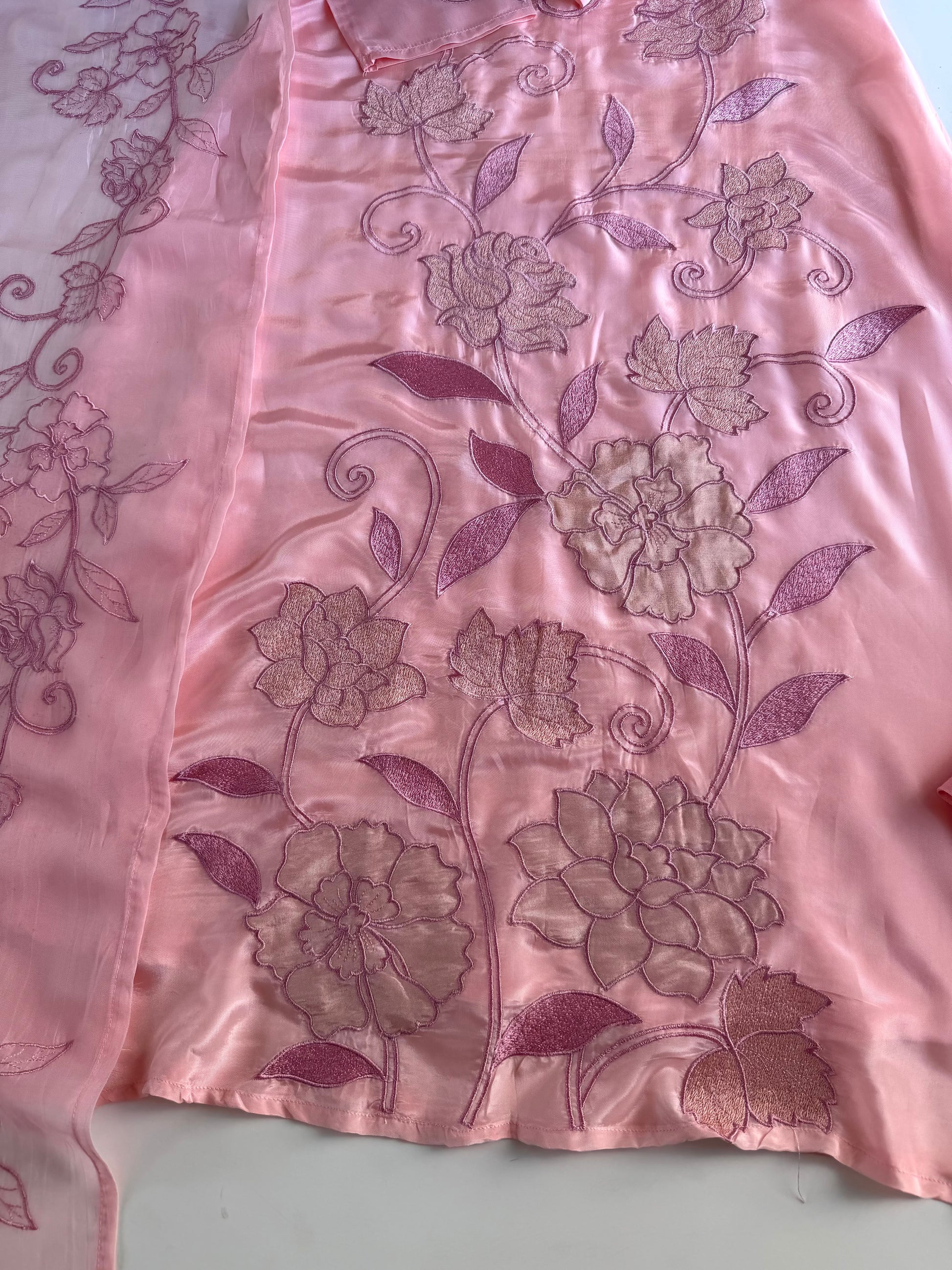 K393 - Viscose organza appliqué work Aline Kurti with pants and dupatta