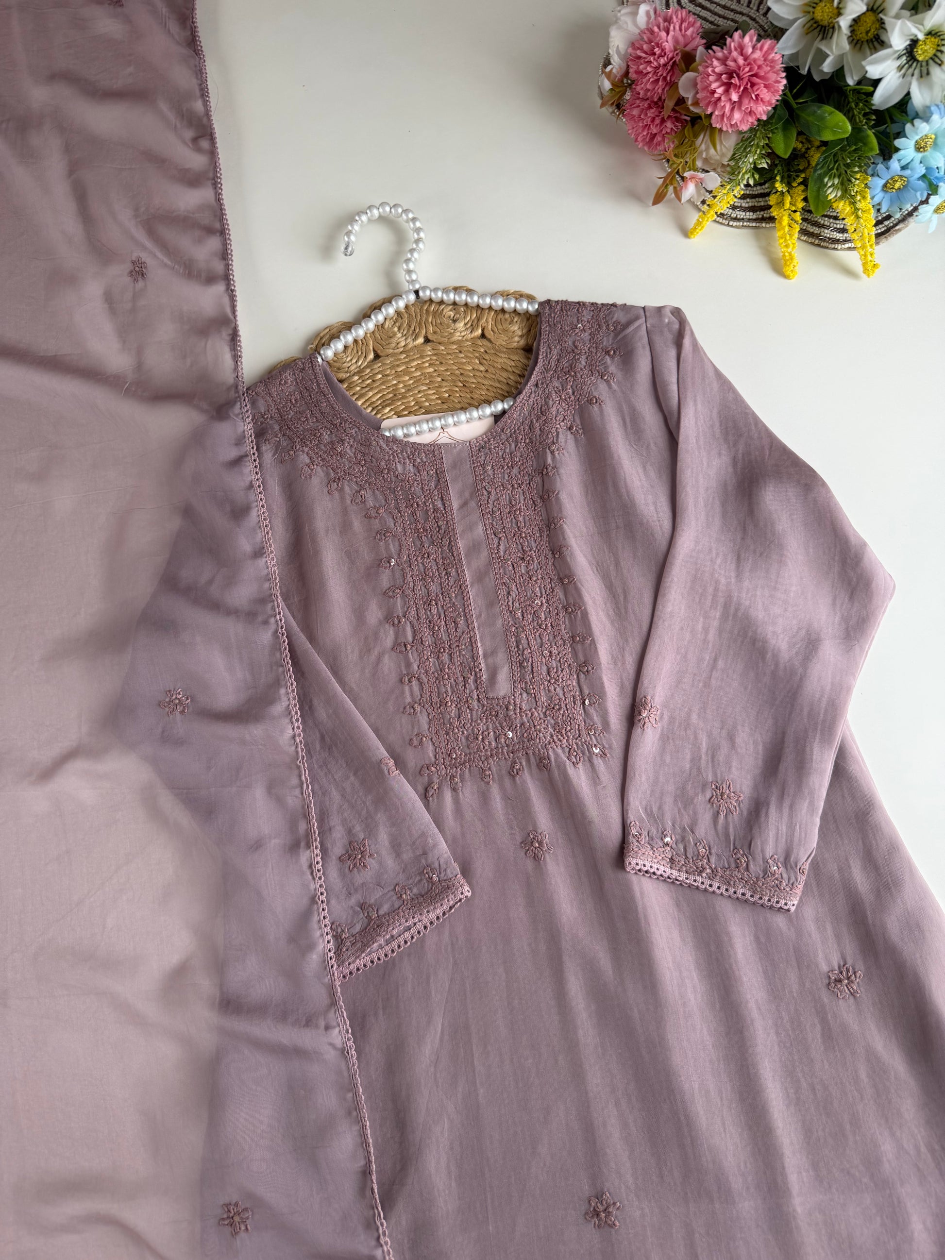 K510 - Viscose organza chikankari straight Kurti with pants and dupatta